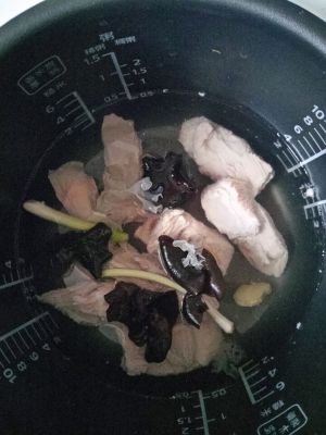 将排骨同放入锅中,放入木耳、银耳、葱、姜、八角。倒入热水盖上电饭锅