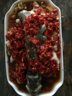 出锅,浇油,放剁椒,放蒸鱼豆豉!