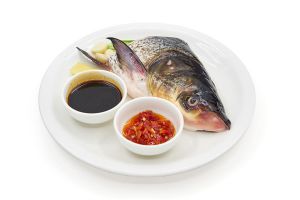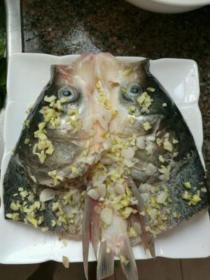 把鱼头用盐反复洗几遍,用厨房纸吸干水份。把盐、鸡精、生粉、油、酱油一起捞匀整个鱼,然后放盘子把姜葱白碎铺鱼头上面。