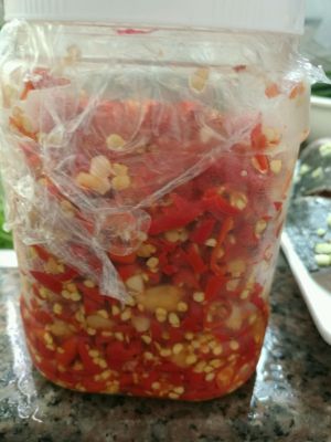 把剁椒三勺平铺鱼头上面,腌十五分钟左右入味点。