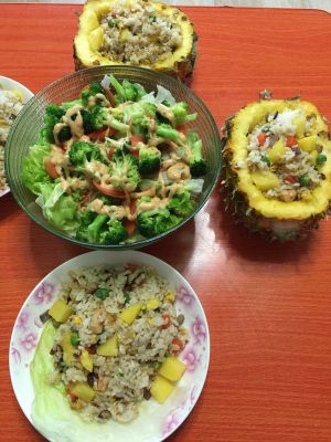 菜锅里烧热放入油、炒鸡蛋。鸡蛋炒的碎一点,盛到碗里。然后锅里放油、炒洋葱碎、煸出香味后放入虾仁,少量料酒跟五香粉。煸炒虾仁变色后、依次放入:香菇、青豆、胡萝卜、适量盐、生抽、椰子粉。基本炒熟后,放入米饭、鸡蛋,翻炒3~5分钟后最后放入切好的菠萝块。大火快炒一会儿就可以关火、然后按照自己的喜好撑出来吃吧。