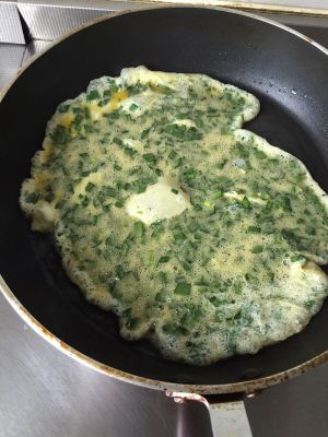 往锅里倒入适量菜油或金龙鱼油等油,等油彻底烧热后,先把调好的蛋液再调一次,然后倒入蛋液下锅翻炒,看见蛋液备油煎脬后翻一面继续煎脬,最后用锅铲搅烂后即可出锅食用,(因为韭菜会浮在蛋液上,为了避免炒出来的口感不好所以要注意这个步骤;还要注意不要把鸡蛋煎糊!)