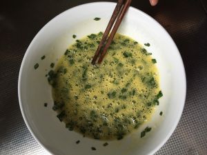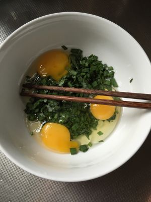 韭菜切碎,放入碗中,打上鸡蛋,加适量盐