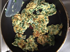 鸡蛋快成型了,放韭菜,小火,翻炒,放点盐