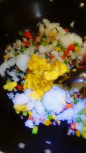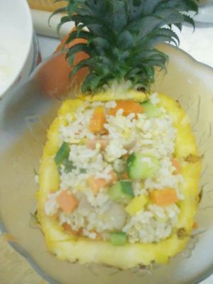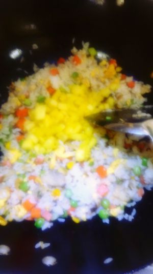 因为是突然想吃,家里没有隔夜米饭,当时蒸的所以还比较有水分,有点黏,先把鸡蛋炒熟,然后下丁,放盐,味精,根据各人口味来吧,接着下菠萝丁,最后下米饭,炒到都入味了起锅,尝了一口,酸酸的味道不错,接着盛到菠萝容器里