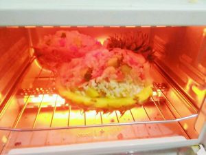接着就是进烤箱了,开心ing,因为比较匆忙所以没有买芝士片,要不然就是香喷喷的菠萝焗饭了,没有烤箱的同志们可以蒸也可以直接就装盘就吃了,个人认为进烤箱蒸后菠萝的酸酸甜甜的味道出来了很好吃,等待出锅就结束