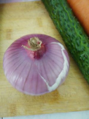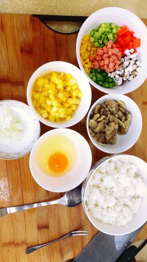 准备食材:黄瓜 胡萝卜 香菇 火腿肠切丁 菠萝也切丁备用 葱切沫
