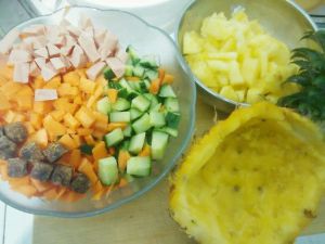 所有的材料都切丁备用,菠萝我是用勺子挖出来的