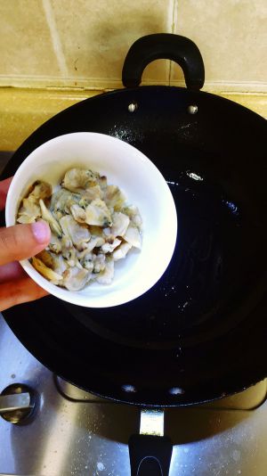 用锅里剩余的油把蛤蜊肉炒熟后盛出备用