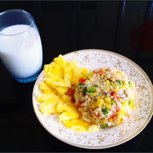 然后放萝卜玉米火腿肠炒均匀,可以尝一下咸淡,不够可以再放点盐,快起锅的时候放入菠萝果肉翻炒一分钟就好了。是不是很简单,当然我这是最简单的食材,还可以放虾仁啊,腊肠等等喜欢的材料,总之不是太抢味的都可以。