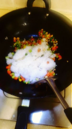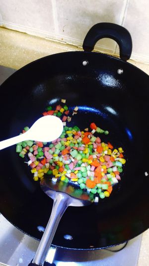 准备的胡萝卜啊玉米火腿肠都切成丁,放油盐炒好待用。