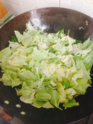 放入圆白菜翻炒,放酱油,盐,炒至变软,关火后放鸡精拌匀即可