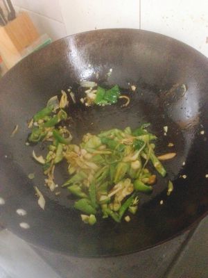 油锅放入蒜,辣椒炒香,倒入包菜翻炒至变软