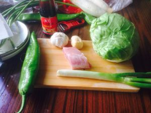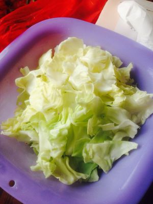 把包菜洗干净后撕成小块free stlye。蒜切片,干辣椒切段