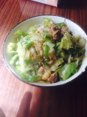 放入包菜进行翻炒、包菜变软后放入炒好的肉片、加入蚝油、生抽、盐。最后放入蒜末提香