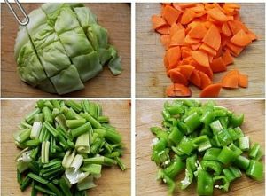 把圆白菜切块,洗净;胡萝卜洗净切块;芹菜去叶洗净,切段;尖椒洗净切块。