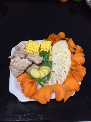 • 排骨用开水烫过后(去血水、血沫)放入料酒、姜片、排骨中火炖20分钟后放玉米、藕片炖10分钟,放入少许盐 • 出锅前放胡萝卜片煮5分钟即可