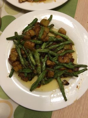 热油,放入豆角,茄子。放蚝油,鸡汁,辣椒蒜,盐,翻炒后出锅。