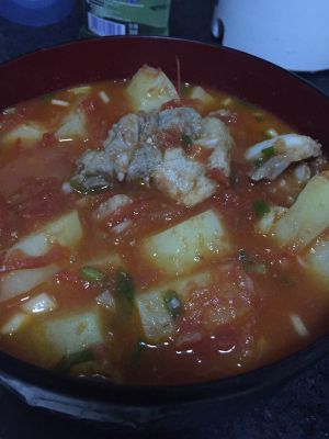 把土豆和排骨倒进砂锅里煮,加入盐。番茄太酸,所以我又加了一些糖,大概10-15分钟?忘记了……土豆要熟一点才好吃哦,用筷子戳一下试试,最后关火前撒葱花