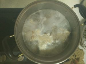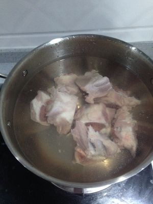 排骨焯水。排骨在凉水中洗干净,放入锅中,加些料酒,锅中加入凉水,放在火上,中小火慢慢烧,等锅烧开后,用勺子撇干净上边的浮沫。