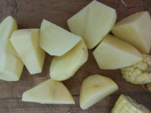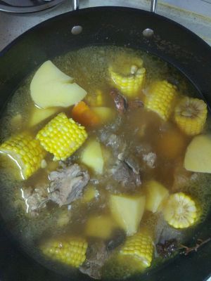 另起一锅水,焯过水的排骨放入水中,放入八角、香叶等大料,倒入少许料酒,大火烧开,调至中小火,炖煮半个小时左右,放入土豆、玉米,在炖二十分钟左右即可出锅,撒入适量盐。
