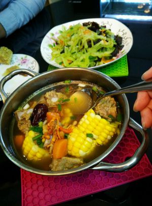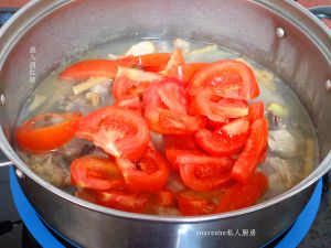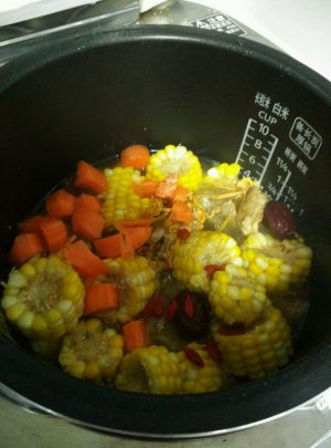 第三部,炖一个小时跳闸后,倒入枸杞,红萝卜,再炖30-分钟到1小时(本人是炖两小时)。炖到一小时20分钟的时候倒入盐,继续炖,最后熟盛锅之前加入,小勺白糖〈可以不加,〉味精品味道,太淡太咸口感依个人适量增加。