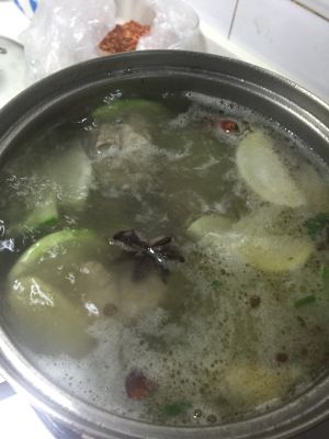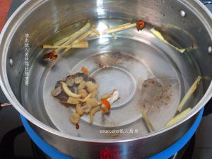 清水,放瑶柱、姜丝、陈皮、八角、沙姜一起煮沸;