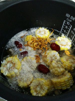 第二步,将排骨倒入电饭锅依次放入拍扁的姜块(1小粒,看大小分多少)。玉米,茯苓粉,虫草花,红枣4粒,倒入老酒,《这里要注意,炖玉米酒很重要,我用的是会稽山》