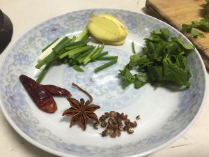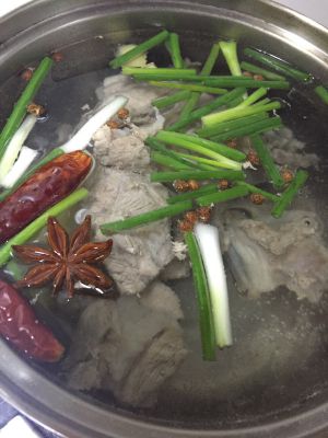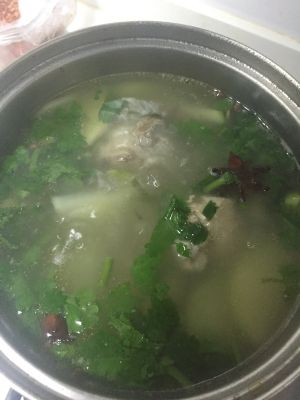 冷水入锅,放入除了香菜的其他调料。不爱吃香菜的小伙伴们也可以不放。大火煮开十分钟后转入小火慢炖。