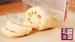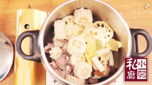把焯好的排骨、莲藕、玉米放入高压锅,再把准备好的葱、姜、蒜、香叶、八角、桂皮也一起放进去。