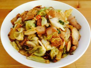 炒锅放油,温热时放入青尖椒干辣椒和姜蓉煸香,放入五花肉片略炒,倒入生抽和蚝油、少许糖炒匀 最后放入包菜,调盐,炒匀即可关火装盘