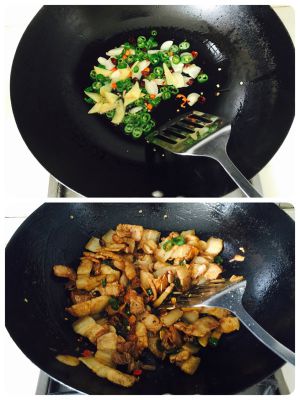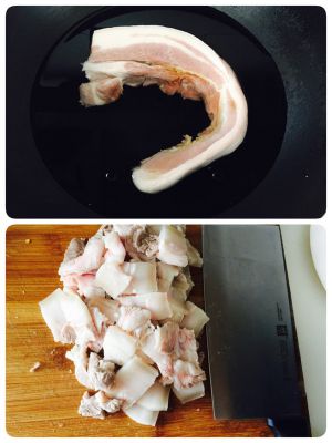 锅里放水,开火,放入姜片和一匙料酒,冷水时即放入五花肉片,大火烧开后,转中小火继续煮10分钟,捞出,过冷水,洗去浮沫切片备用