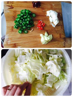 准备食材:姜蒜切片备用,青尖椒干辣椒切丝或圈,用水稍泡一下捞出备用(用水泡一下在炒时不容易炒黑) 包菜用手撕成大块,烧一锅开水,放入包菜略烫一下(约30秒),捞出过冷水沥干水份备用