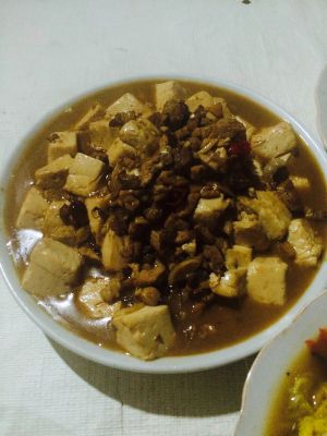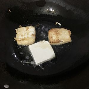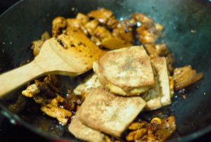 加煎好的嫩豆腐翻炒,放一小碗水,稍微焖一下让豆腐吸收汤汁,以便入味。最后加适量盐、鸡精调味即可出锅。