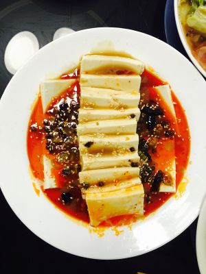 炒锅内用油爆香葱花,花椒粒和红辣椒段。然后直接浇在豆腐上。