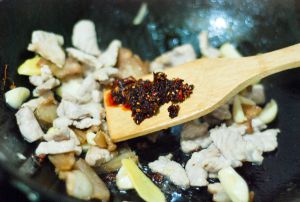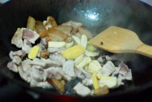 至猪肉出油脂时,放入姜、蒜、葱花、泡椒炒香;