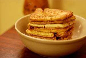 不粘锅热油后,将切块的豆腐,裹一层蟹黄直接下锅,注意火候,小火煎2分钟,换一边煎,直至两边金黄色