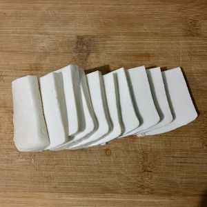 将保鲜冷冻的嫩豆腐切成薄片,摆盘。