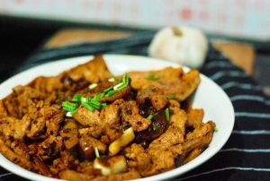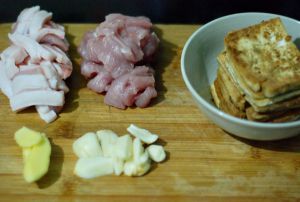 猪肉肥瘦分开,切片,煎好的豆腐,姜蒜备好,还有花椒(忘拍)。