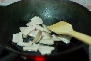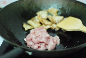 锅里只留适量的油,放瘦肉到锅里翻炒至变色。