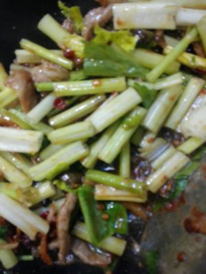 加少许白开水煮沸(使肉入味),放入切好的芹菜,炒拌好即可