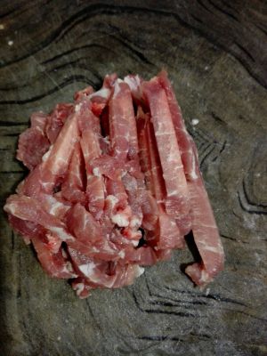 热锅做油,放肉丝,爆炒。加老抽,盐,少许黄酒,生抽。