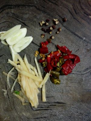泡姜切丝,泡辣椒切节,蒜切片,花椒备好,芹菜择好洗净切节(忘拍照了)。