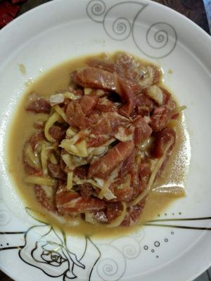 切好的肉丝,加入姜丝,花椒,生抽,料酒,芡粉,抓匀,腌10分钟