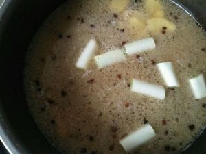 排骨过水的时候,水里加点料酒去腥,捞出来备用,黑玉米切成小段,白萝卜去皮切成小段备用。