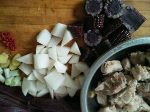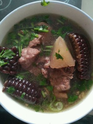 加上水,如果想多喝汤可以多加点,然后倒入高压锅或者砂锅炖,这时候先不要放黑玉米和萝卜,放早了萝卜会烂,等排骨炖的差不多熟了,在放入黑玉米和萝卜炖10分钟。