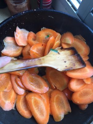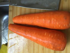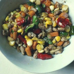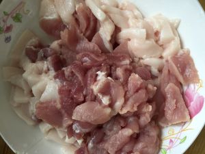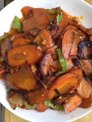 起锅热油,放入切好的肉,炸至变色,放入切好的胡萝卜,中火炒至变色,放入青椒,蒜,翻炒两下,放入鸡精,豆瓣酱翻炒