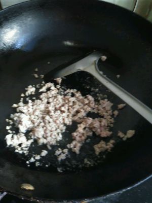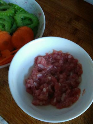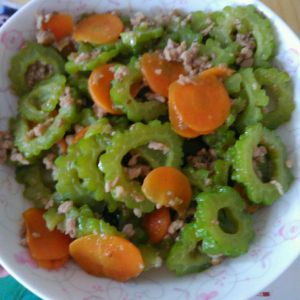 炒锅加少量油,先把肉沫快速炒一下盛出。重新起油锅,放入刚才过水后的苦瓜和胡,加盐加少许糖,翻炒3-5分钟入味,再加入肉沫继续翻炒2-3分钟。淀粉用一个小碗加水调匀,出锅前倒入锅中,最后迅速翻炒并加入味精出锅。
