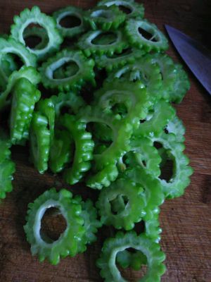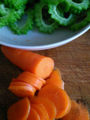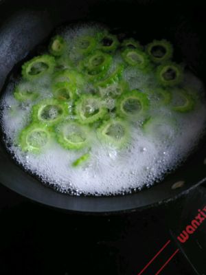 先把苦瓜在沸水中过一下,水中加点盐能保存苦瓜的绿色,大概煮2分钟左右后把苦瓜捞出,并倒掉苦瓜水。