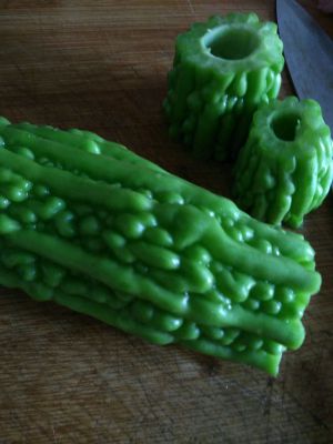 选一个新鲜的苦瓜洗净,切开几段把中间的仔去除。